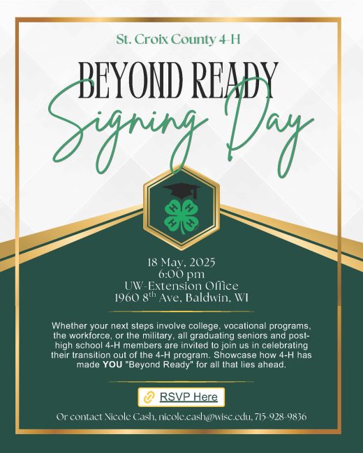 Beyond Ready Signing Day Share Share:Share on FacebookShare on X (Twitter) Share via EmailCopy LinkCopied! You are viewing information about a past event. Event Information Date May 18th, 2025Time 6:00pm - 7:00pm Event LocationUW Extension Office 1960 8th Ave. Baldwin WI